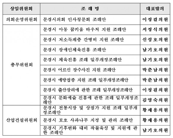 의원 발의로 제출된 조례안은 「문경시의회 인사청문회 조례안」(이정걸 의원 대표발의) 등 총 12건으로, 시민 복지 증진, 지역경제 활성화, 기후변화 대응 등 다양한 분야에서 실질적 변화를 이끌기 위한 내용을 담고 있으며 심도 있는 논의 끝에 모두 원안 가결되었다.