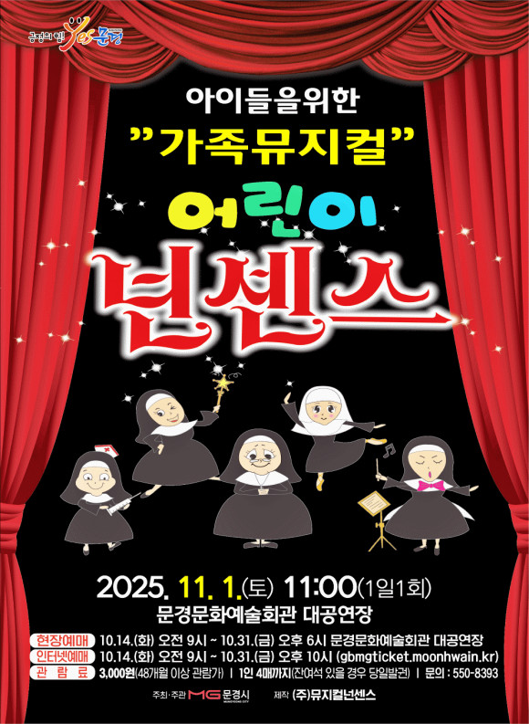 |  | | | ⓒ 문경시민신문 | | 문화예술회관에서는 11월 기획공연으로 화끈하고 재미있는 수녀들의 이야기를 담은 뮤지컬 ‘어린이 넌센스’공연을 11월 1일(토) 11:00에, 뮤지컬‘넌센스’공연을 11월 1일(토) 17:00에 각각 문경문화예술회관 대공연장에서 진행한다.