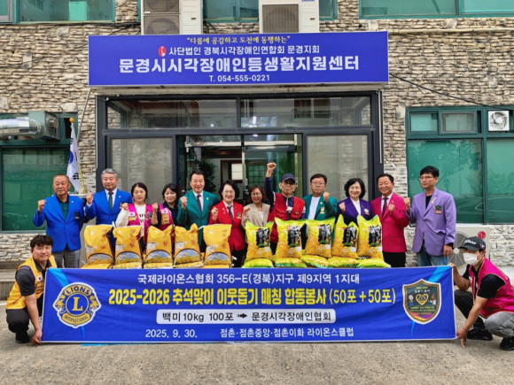 |  | | | ⓒ 문경시민신문 | | 국제라이온스협회 356-E 경북지구 제9지역 1지대(점촌·점촌중앙·점촌이화라이온스클럽)는 9월 30일 ‘2025-2026 추석맞이 이웃돕기 매칭 합동봉사’의 일환으로 문경시시각장애인등생활지원센터(센터장 민난주)를 방문해 백미 10kg 100포를 전달했다.