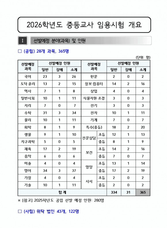 올해 채용 규모는 총 487명으로, 공립 365명과 사립 122명을 선발한다. 공립은 중등교사, 특수(중등)․전문상담․영양․보건․사서교사 등 28개 과목 365명(장애인 구분모집 31명 포함)으로, 전년도(280명)보다 85명 늘었다. 사립은 43개 법인에서 위탁한 22개 과목 122명을 모집한다.