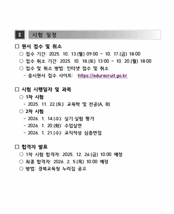 1차 시험은 11월 22일(토), 2차 시험은 2026년 1월 14일(수)과 1월 20일(화)~21일(수)에 실시된다. 최종 합격자는 2026년 2월 5일(목) 경북교육청 누리집을 통해 발표될 예정이다.