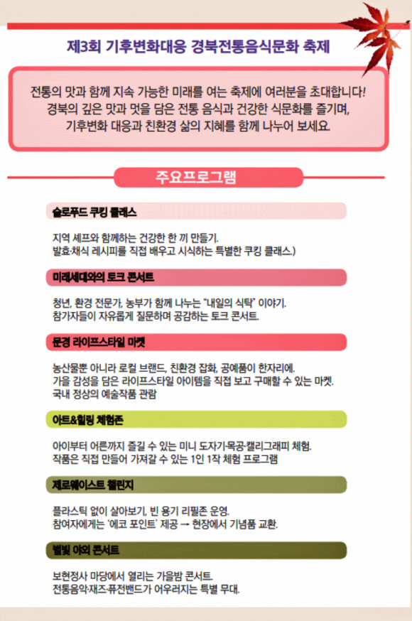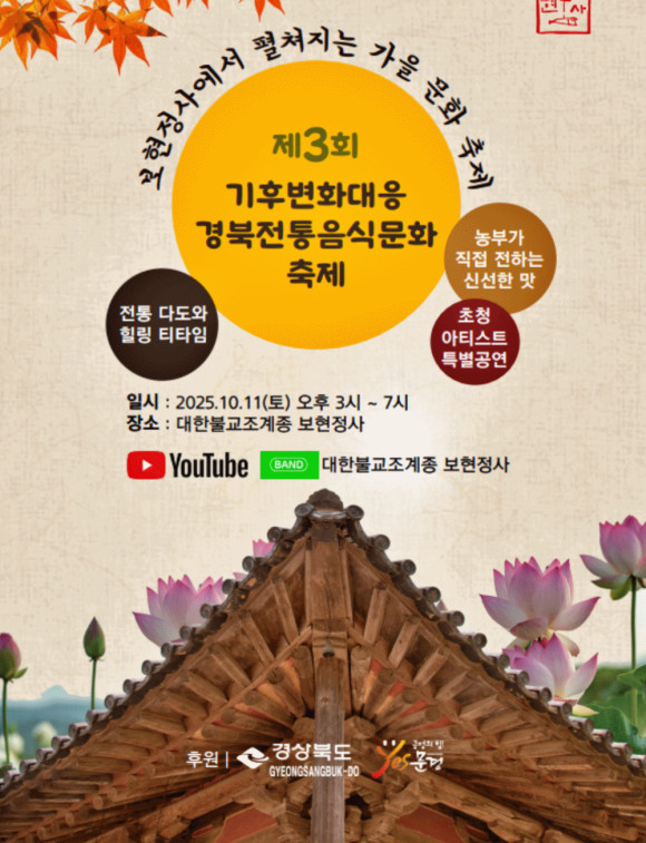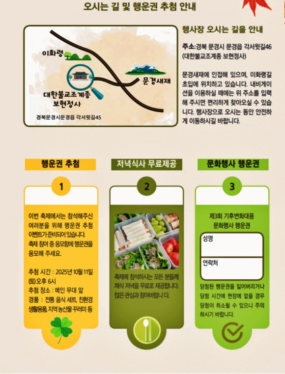 이번 행사는 ‘한 그릇의 자비, 하나됨의 자리’라는 주제로 진행되며 ▲ 전통 사찰 음식 기반의 채식 공양 무료 나눔 ▲ 생명과 자연을 주제로 한 산사 토크 마당 ▲ 비건 실천을 체험하는 생활 부스 ▲ 채식과 자비를 노래하는 대규모 라이브 공연 ▲ 문경 지역 농산물 나눔 등 이웃과의 따뜻한 연대 프로그램으로 구성될 예정이다.