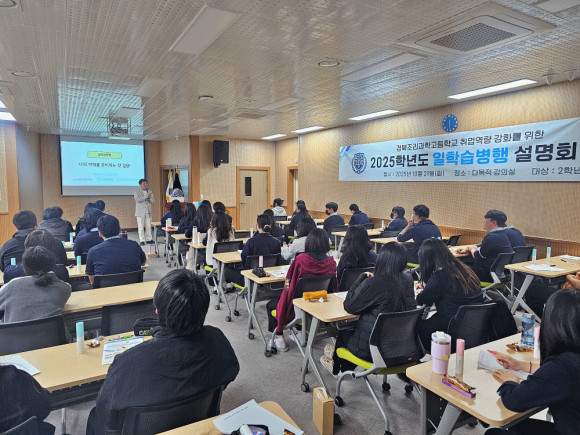 |  | | | ⓒ 문경시민신문 | | 경북조리과학고등학교(교장 강미경)는 2025년 10월 21일 본교 강당에서 일학습병행 설명회를 개최했다. 이번 설명회는 전국 일학습병행 시행기관인 6개 대학을 모두 초청하여 진행되었으며, 2학년 학생들이 참석하여 조리 분야의 실무 경험을 쌓을 수 있는 기회에 대해 안내를 받았다.