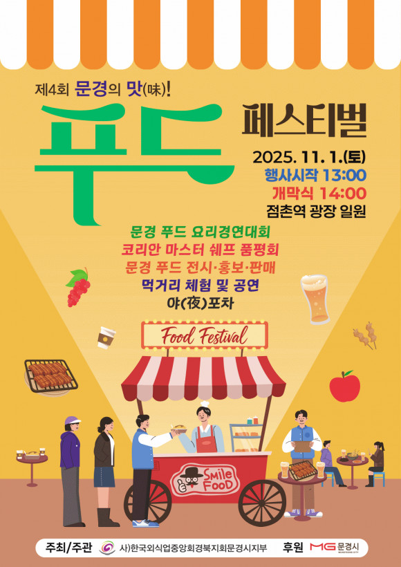 |  | | | ⓒ 문경시민신문 | | 문경시는 오는 11월 1일 점촌역 광장에서 한국외식업중앙회 경북문경시지부 주최·주관으로 「제4회 문경의 맛! 푸드페스티벌」을 개최한다.