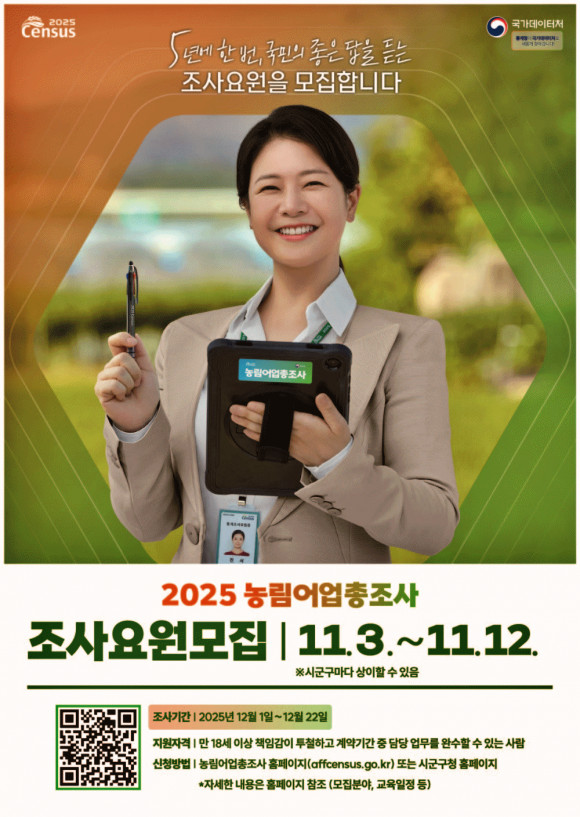 |  | | | ⓒ 문경시민신문 | | 문경시는 '2025 농림어업총조사'를 위해 11월 3일부터 11월 12일까지 조사관리요원 12명, 조사원 80명 등 총 92명을 선발한다.