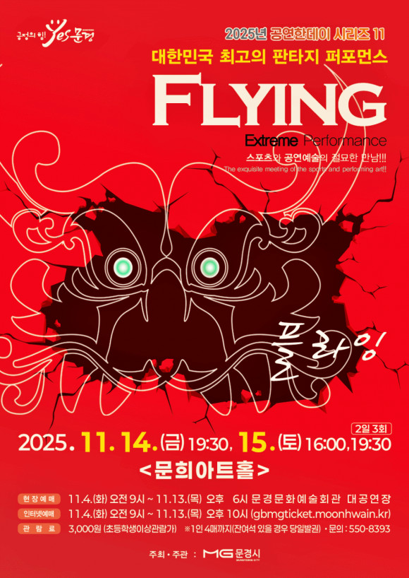 |  | | | ⓒ 문경시민신문 | | 문경문화예술회관은 오는 11월 14일~15일 19:30, 15일 16:00 문희아트홀에서 2011년 경상북도와 경주시가 공동 제작해 경상북도 대표 웰메이드 공연으로 자리잡은 넌버벌 퍼포먼스 ‘플라잉’공연을 선보인다.