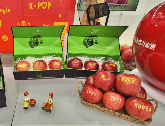 이번에 납품된 ‘문경 감홍 문자사과’는 APEC 2025 KOREA, K-POP 등 문자와 대한민국을 상징하는 금관, 첨성대 등 문양을 새긴 사과로, 다맛농원(대표 이문재), 송제농원(대표 박인수), 토끼와옹달샘(대표 권순용), 애플스타(대표 노진수), 아자개농원(대표 박왕규) 등 문경 지역 5개 농가가 문자사과 납품에 참여했고, 엄선된 문자사과는 정상회의 주간 회의장, APEC 경제전시관, 국제미디어센터 등 21개 회원 정상과 대표단, 기업인과 언론인 등에 선보이게 된다.