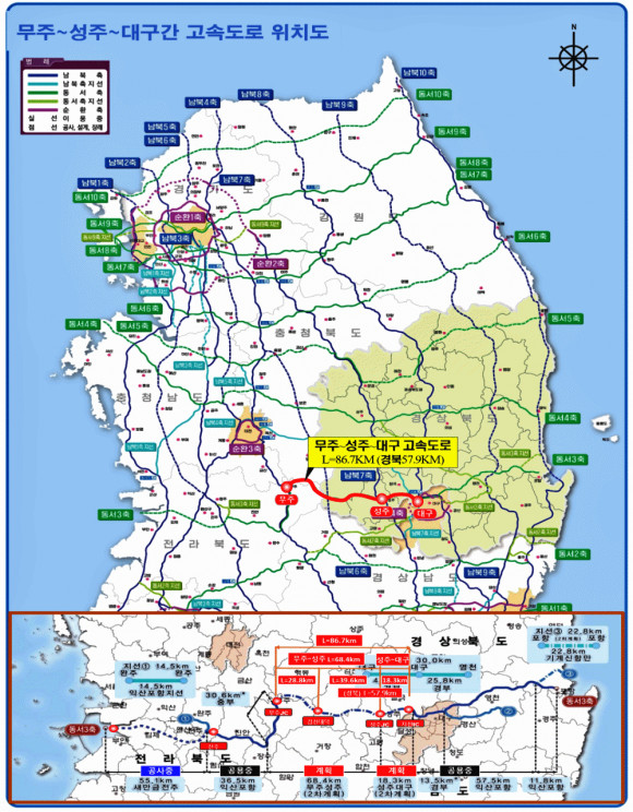 이번에 선정된 무주~성주~대구 간 고속도로는 동서3축의 유일한 단절 구간으로서 왕복 4차로 86.7㎞를 건설하는 사업으로 7조여원이 투입되는 대형 SOC사업이다.