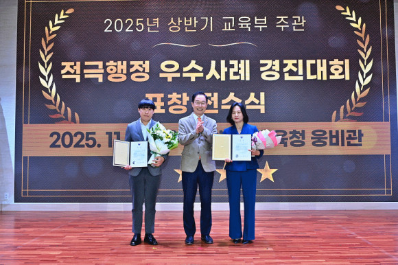 이어진 적극행정 표창 전수식에서는 △교육안전과 박찬병 주무관이 ‘학교급식소용 말림방지장갑 개발’로 최우수상을, △유초등교육과 전인순 장학사가 ‘학생 마음건강 통합 안전망 구축’으로 우수상을 수상했다. 경북교육청은 이번 수상으로 9년 연속 교육부 적극행정 우수기관의 명예를 이어가게 됐다.