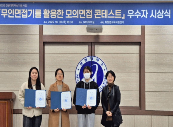 |  | | | ⓒ 문경시민신문 | | 문경대학교(총장 신영국) 취창업교육지원센터(센터장 신경주)는 전문대학혁신지원사업의 일환으로 지난 10월 30일 ‘2025학년도 무인모의면접 콘테스트 시상식’을 개최했다고 밝혔다.