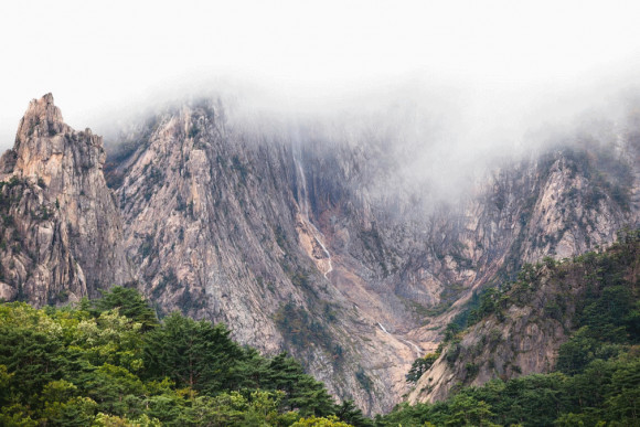 토왕성 폭포의 근원이 되는 산과 하늘의 기운을 먼저 포착합니다.