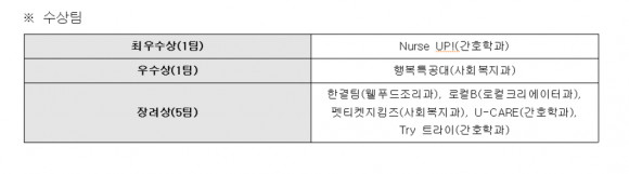 치열한 경합 끝에 간호학과 ‘Nurse UP!’ 팀이 ‘수액세트함과 오뚝이 혈액배양’을 주제로 최우수상을 차지했다. 이어 사회복지과 ‘행복특공대’ 팀은 ‘마음을 잇는 한 끼, 릴레이 안부 메시지’를 주제로 우수상을 수상했다.