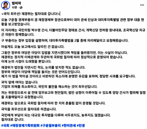 임 위원장은 끝으로 “재경위는 앞으로도 국회법 절차에 따라 한 치의 흔들림 없이 운영될 것”이라며, “국민에게 부담이 될 수 있는 대규모 투자법을 다루는 만큼 서두르지도, 늦추지도 않고 절차대로 가겠다”고 강조했다.