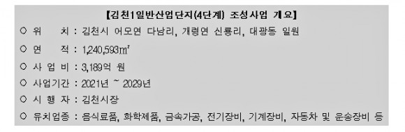 김천1일반산업단지(4단계) 조성사업은 총사업비 3,189억 원을 투입해 어모면 다남리, 개령면 신룡리, 대광동 일원에 124만㎡ 규모로 조성되며, 2029년 준공을 목표로 추진된다.
