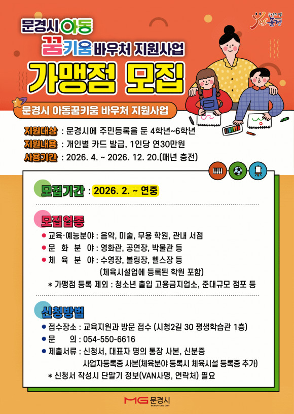 이번 사업은 문경시에 주민등록을 둔 초등학교 4학년부터 6학년까지 아동을 대상으로 개인별 전용 바우처 카드를 발급해 1인당 연간 30만 원을 지원하는 맞춤형 사업이다. 바우처 사용 기간은 2026년 4월부터 12월 20일까지다.