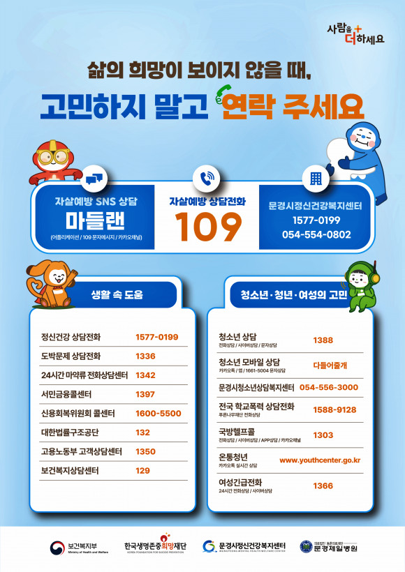 정연재 문경시정신건강복지센터장은“삶의 위기에 처한 이들이 희망을 찾을 수 있도록 다양한 자살 예방 사업을 통해 지역사회에 생명 존중 문화를 확산시켜 나가겠다”면서, “우울감과 극심한 스트레스 등으로 전문가의 도움이 필요한 경우 24시간 자살 예방 상담전화 ☎109에 도움을 요청해 달라”고 말했다.