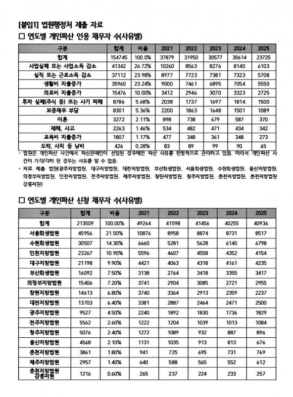 최근 5년간 개인파산 인용 약 15만 5천명… 사유 절반 이상이 사업 실패·실직