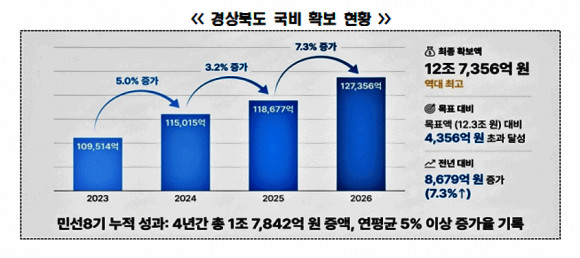 경북도는 지난해 새 정부 출범으로 정책 환경이 급변한 상황에서도 12조 7,356억 원의 국비를 확보하며 민선 8기 4년간 국비 확보 증가세를 이어가고 있다.