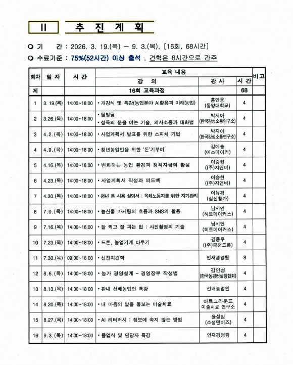 이번 청년농업인과정은 3월 19일 개강식을 시작으로 9월 3일까지 총 16회에 걸쳐 운영될