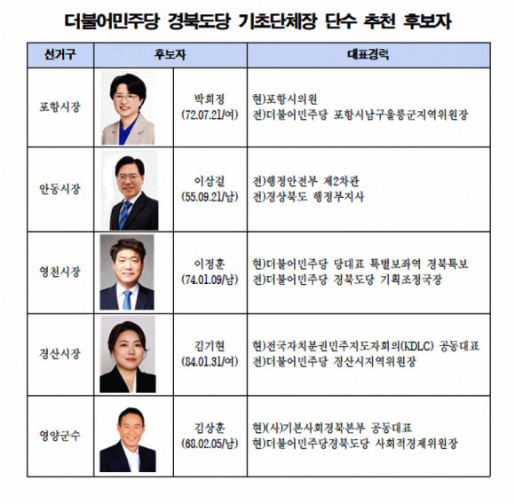 경북도당 공직선거후보자추천관리위원회(이하 공관위)는 기초단체장 선거구 포항시장 박희정 현)3선 포항시의원, 안동시장 이삼걸 전)행정안전부 제2차관, 영천시장 이정훈 현)더불어민주당 당대표 특별보좌역 경북특보, 경산시장 김기현 현)전국자치분권민주지도자회의 공동대표, 영양군수 김상훈 현)(사)기본사회경북본부 공동대표, 영덕군수 강부송 전)더불어민주당 군위의성청송영덕 지역위원장, 칠곡군수 김시환 전)경북도의원, 예천군수 윤동춘 전)경상북도 경찰청장, 울릉군수 정성환 전)4선 울릉군의원 등 9곳을 단수 후보로 추천했다.