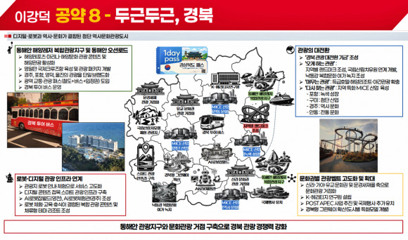 그는 “경주·포항·영덕·울진을 잇는 ‘동해안 해양레저 복합관광지구’와 ‘오션로드’를 구축해 분산된 관광 자원을 단일 브랜드로 통합하겠다”며 “철도·버스·관광지 입장권을 결합한 광역 교통·관광 패스를 도입하고, 광역 투어버스를 운영해 관광 편의성을 높일 것”이라고 밝혔다.