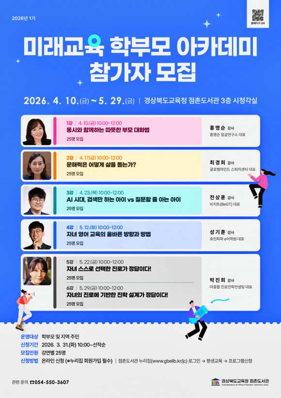 |  | | | ⓒ 문경시민신문 | | 경상북도교육청 점촌도서관은 4월 10일부터 5월 29일까지 학부모 및 지역주민을 대상으로「미래교육 학부모 아카데미」를 운영한다.