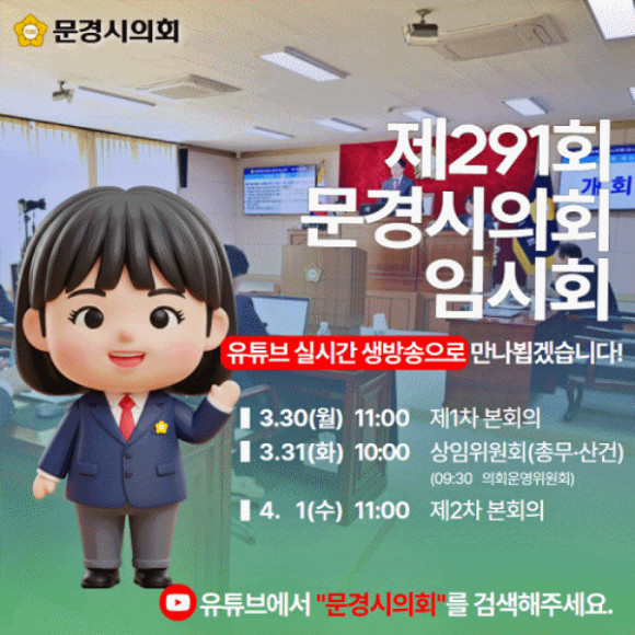 |  | | | ⓒ 문경시민신문 | | 문경시의회(의장 이정걸)는 오는 3월 30일부터 4월 1일까지 열리는 제291회 임시회부터 공식 유튜브 채널을 통해 의회 회의 전 과정을 실시간으로 중계한다고 밝혔다.