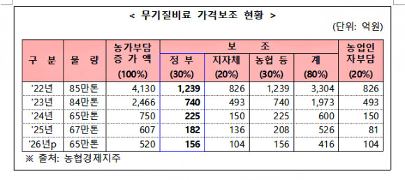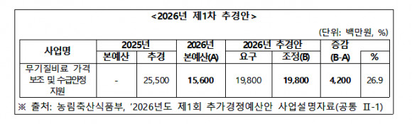 또한, 2026년 본예산은 무기질비료 65만톤에 톤당 8만원을 적용해 156억원을 편성했으나, 정부는 이번 추경에서 3분기 14만톤에 한정해 단가를 10만원으로 올리고 4분기 물량은 아예 제외했다.