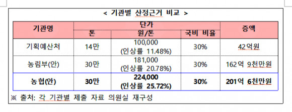 농림축산식품부와 농협경제지주는 국제 원자재 가격과 고환율 등을 반영해 하반기 30만톤 물량에 톤당 최소 18만 1천원(인상률 20.78%)에서 최대 22만 4천원(인상률 25.72%)을 적용해 최소 163억원에서 최대 202억원까지 증액이 필요하다는 입장이지만, 기획예산처는 절반 수준인 42억원으로 축소 편성했다.