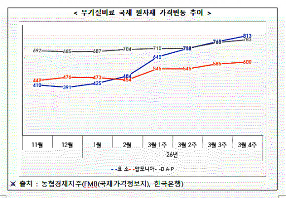 정부는 무기질비료 가격보조 추경예산을 42억원 증액했지만, 중동전쟁으로 폭등한 국제 원자재 가격과 고환율을 제대로 반영하지 못해 농가 경영지원에 턱없이 부족하다는 지적이다.