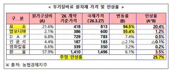 중동전쟁(2월 28일 개전) 이후 요소 94.5%, 암모니아 55.4% 등 주요 원자재 가격이 급등했고, 이러한 추세가 하반기 내내 이어질 것으로 예상되는 상황에서 4분기 지원을 제외한 것은 농가 현실을 외면한 결정이라는 지적이다.