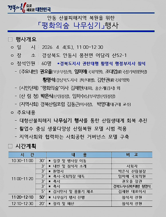 이번 행사는 지난해 경북 초대형 산불로 훼손된 안동 지역 산림을 복원하고 탄소중립 실천을 위해 마련됐다. 행사에는 권오을 국가보훈부 장관, 임미애 국회의원, 박은식 산림청장 등이 참석했다.