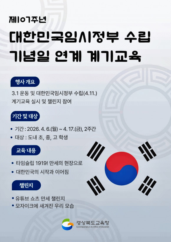 |  | | | ⓒ 문경시민신문 | | 경북교육청(교육감 임종식)은 제107주년 대한민국임시정부 수립 기념일(4월 11일)을 맞아 6일부터 17일까지 2주간 도내 학생을 대상으로 계기 교육을 운영한다고 밝혔다.