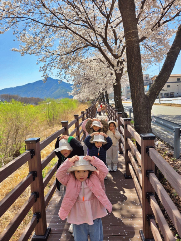 유아들은 형님들과 함께 벚꽃이 만개한 길을 걸으며 봄의 정취를 느끼고, 자연 속에서 즐거운 시간을 보냈다. 처음에는 “힘들어요”라고 말하던 유아들도 형님들과 함께 걸으며 점차 웃음을 되찾고 끝까지 완주하는 모습을 보였다.