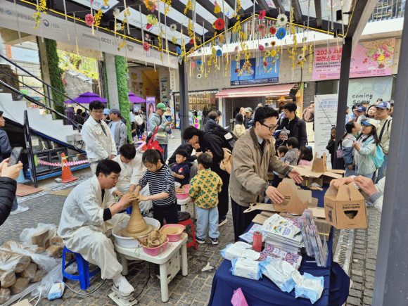 |  | | | ⓒ 문경시민신문 | | 홍보 현장에는 축제의 주역들이 직접 참여하여 현장감을 높였다. 박연태 축제추진위원장을 비롯해 도광요 김경선 명장, 공림요 홍진석 작가, 관욱요 김수태 작가가 직접 전통 발물레 시연을 선보였다. 장인의 정교한 손길로 찻사발이 빚어지는 과정은 인사동을 찾은 수많은 관람객의 발길을 붙잡으며 큰 호응을 이끌어 냈다. 특히, 현장에 마련된 전기물레 3대를 활용한 찻사발 빚기 체험은 가족 단위 관광객과 외국인들에게 단연 인기였다. 체험 대기 줄이 길게 늘어설 만큼 인산인해를 이루며, 남녀노소 국적을 불문하고 문경 도자기의 매력에 푹 빠지는 기회를 제공했다.