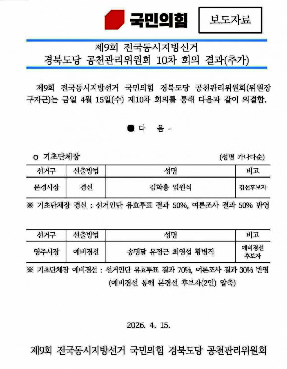 국민의힘 경북도당은 지난 15일 공천관리위원회 10차 회의를 열고 심사숙고 끝에 이같이 결정했다고 16일 밝혔다.